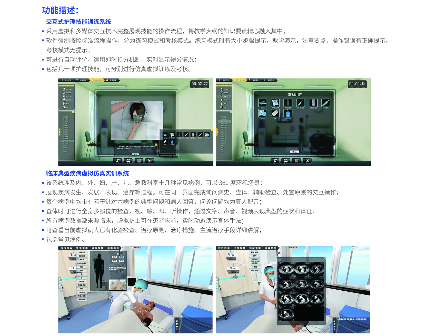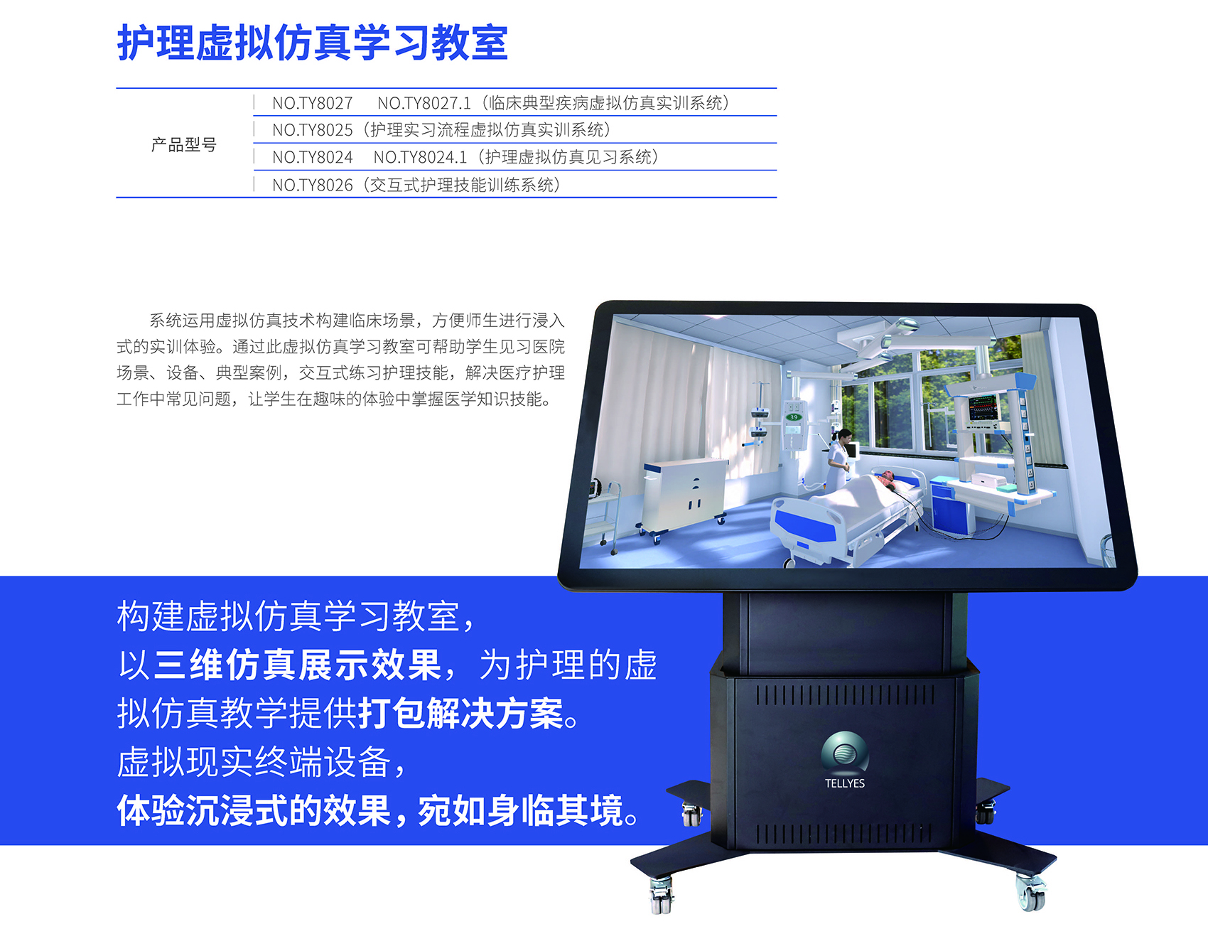 产品型号 NO.TY8027 NO8027.1(临床典型疾病虚拟仿真实训系统)丨NO.8025(护理实习流程虚拟仿真实训系统)丨NO.TY8024 NO.8024.1(护理虚拟仿真见习系统)丨NO.TY8026(交互式护理技能训练系统)